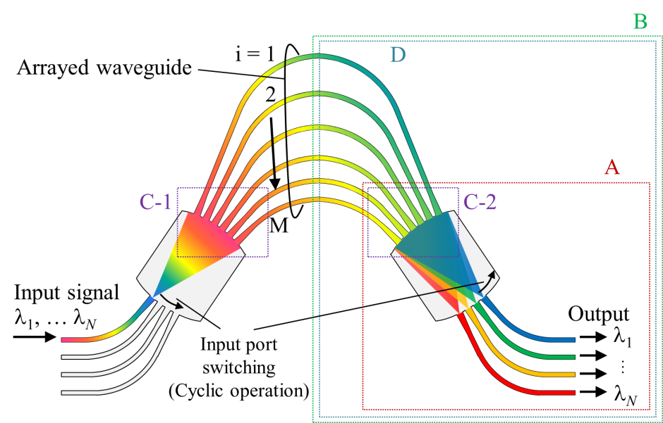 Fig. 2 Conventional AWG structure. We investigate AWG performance enhancements by improving parts in A, B, C, and D