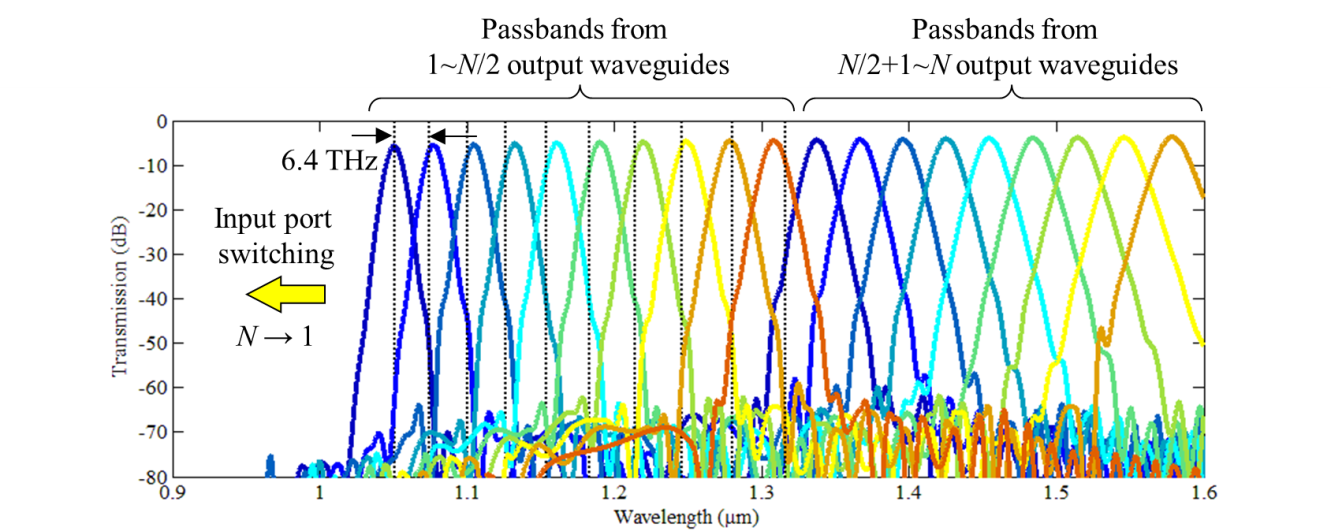 We designed a 10-ch, 6.4 THz spaced cyclic AWG. Fig. 4 shows the transmission spectrum for input port N. On the left side of the passbands resulted from output ports 1~N/2 are the passbands resulted from output ports N/2+1~N. Switching the input port from N to 1 will shift the passbands to the left side, which confirms that cyclic operation is possible. The largest deviation is 26% of the channel spacing in a frequency grid