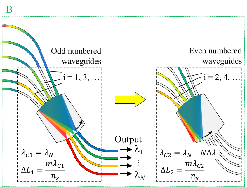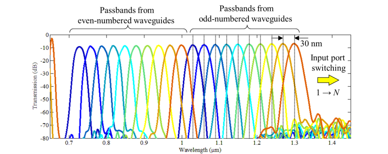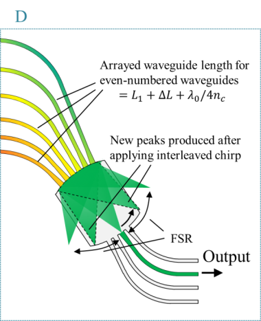 Fig. 9 shows the operating principle of the AWG. Neighboring peaks are produced at half of the FSR by the interleaved chirp waveguides to enable cyclic operation.