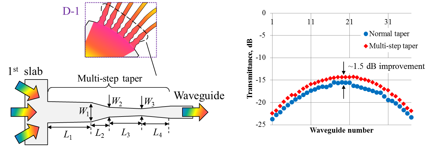 ⇒To reduce loss, we proposed employing multi-step taper structures on the boundary of the 1st slab waveguide and arrayed waveguides.