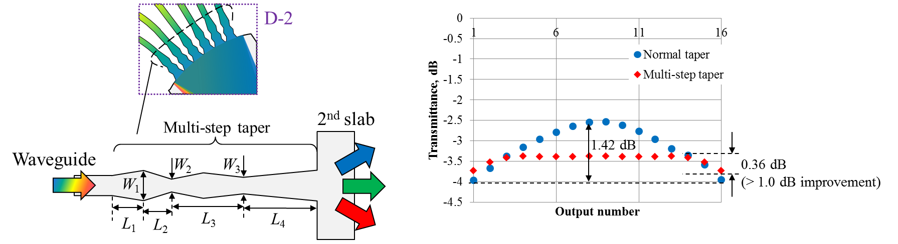 ⇒We proposed employing and optimizing multi-step taper structures on the boundary of the 2nd slab waveguides and arrayed waveguides to reduce loss imbalance between channels