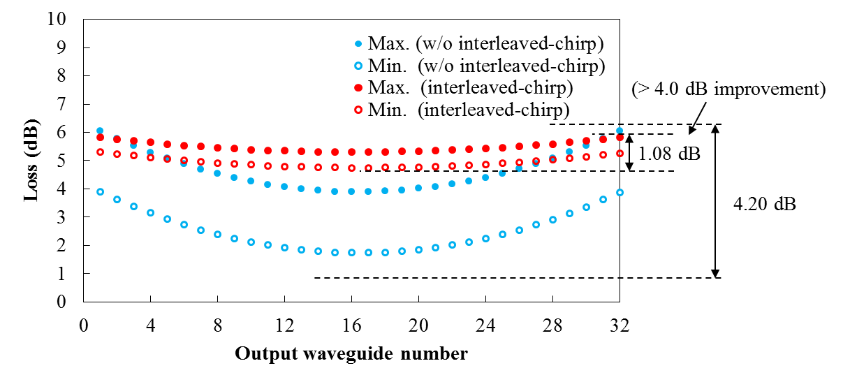 We designed a 32-ch, 50 GHz spaced AWG. The loss imbalance is reduced as much as 4.0 dB compared to normal AWG. The maximum and minimum loss of each output port of the AWG is shown in Fig. 10.