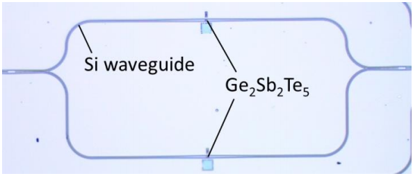 マッハツェンダー干渉(MZI)型光スイッチの構造と光学顕微鏡写真を図5と図6に示す。相変化材料の相変化により伝搬光の位相をシフトさせ、出力波長を切り替えることが出来る。